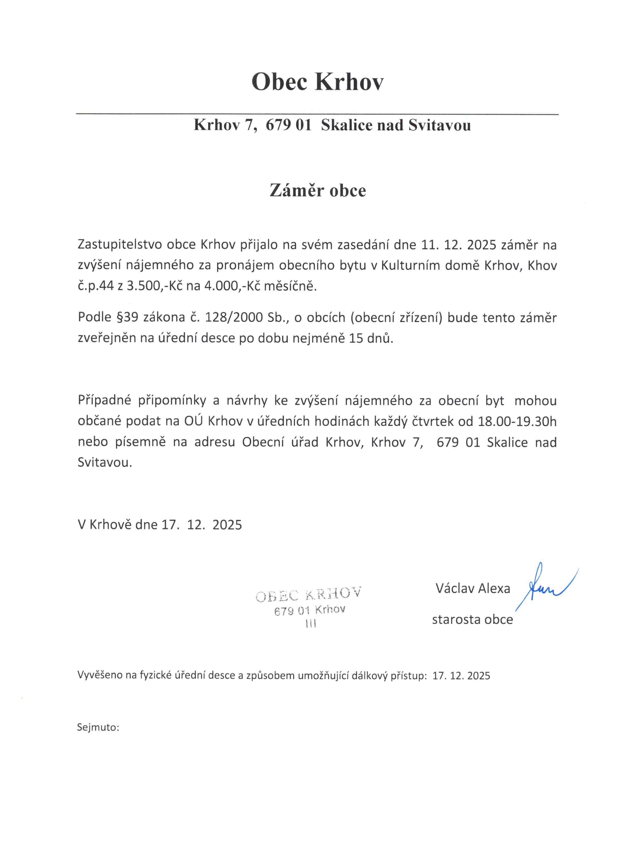Záměr obce Krhov na zvýšení nájemného za obecní byt