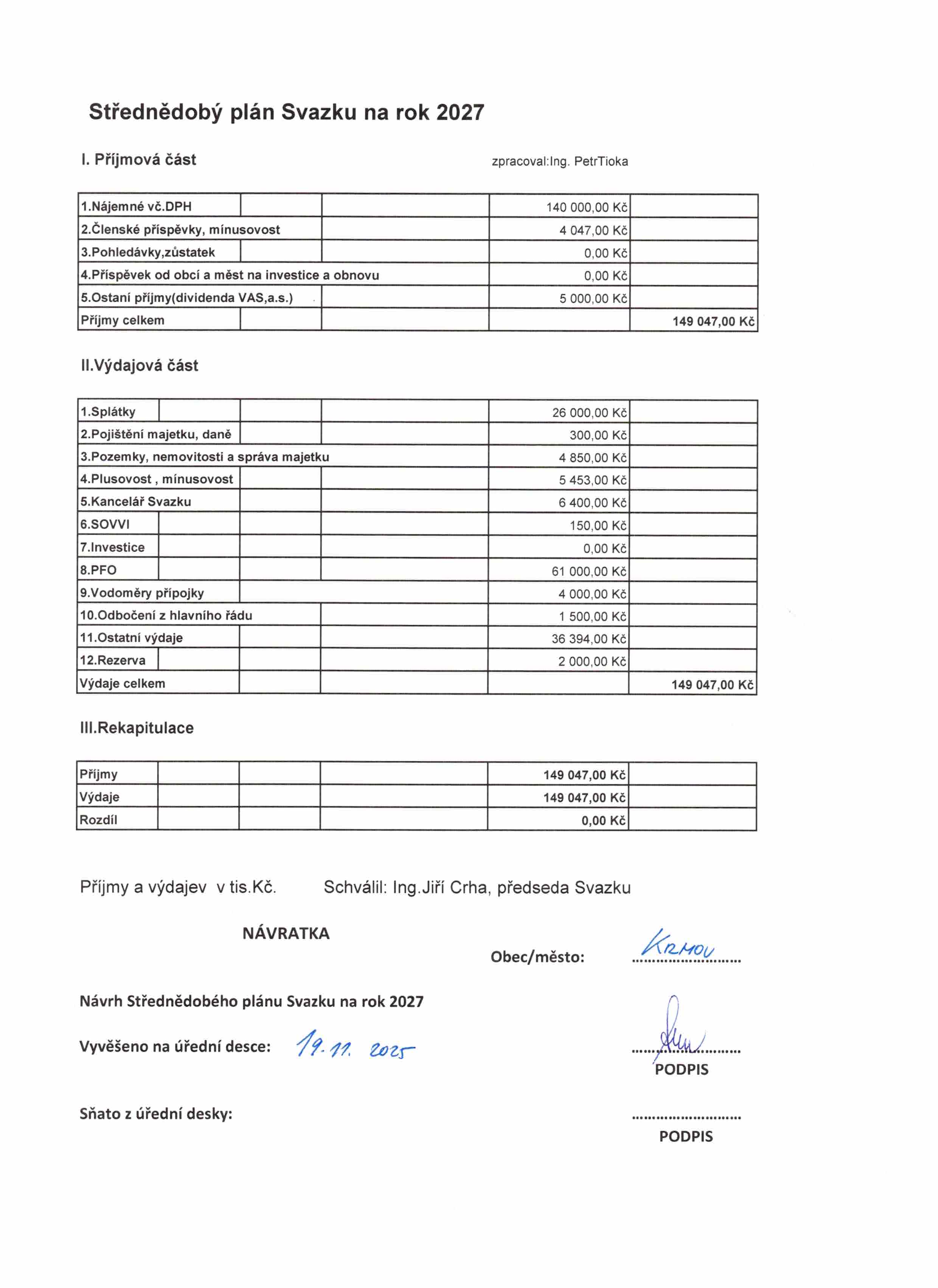 které se uskuteční ve čtvrtek 13. 11. 2025 v 18:30 h. v zasedací místnosti Obecního úřadu Krhov.